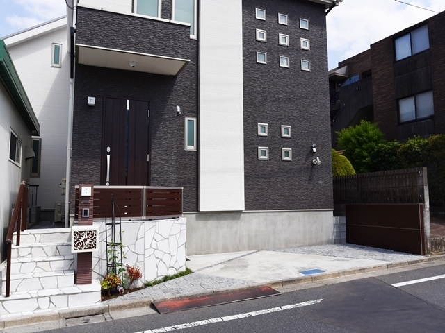 建物から道路までの距離も短く、玄関の位置も高かったので、階段の割り付けを工夫しました。駐車スペースの確保も考慮しながら、建物のシンプルモダンのイメージと合わせたデザインをご提案しました。