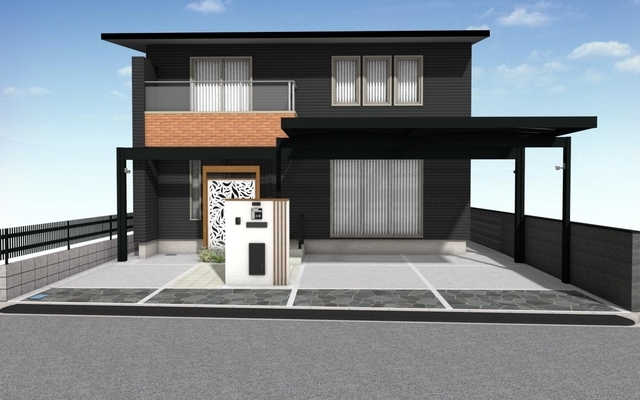 利便性とデザイン性を重視した、カーポートと目隠しスクリーンを取り入れたプランをご提案させていただきました。アルミ材の色味は建物と合わせたブラックとオレンジがかった木李朝のナチュラルウッド、床や壁にタイルや石材を使用し、落ち着きのある外構デザインです。