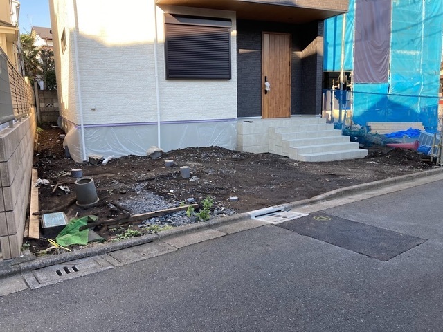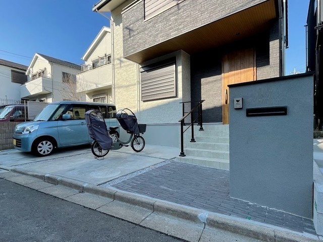 建物にアプローチのインターロッキングや門袖の色味を合わせることで、シンプルでまとまりのある外構となっています。