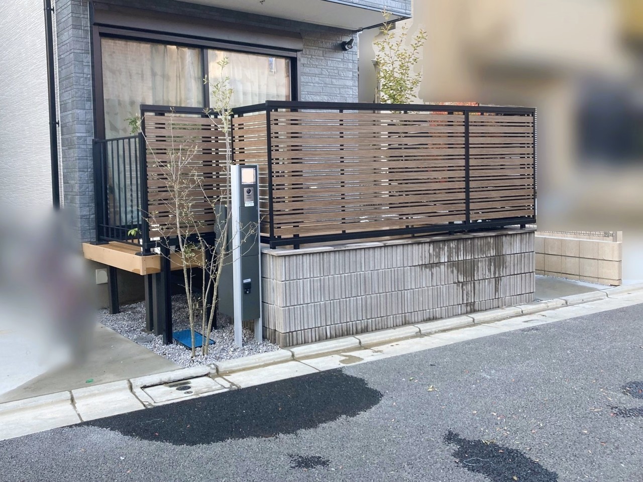 デッキ前には目線をカットする目隠しフェンスを設置し、プライバシーにも配慮した居心地の良いアウトドアリビングを作っています。フェンスは木目調のアルミ製フェンス・タカショーのエバーアートフェンスセンシアを取付けました。アルミなので経年劣化が無く、木目調でナチュラルな雰囲気を演出しています。