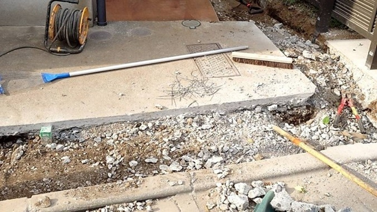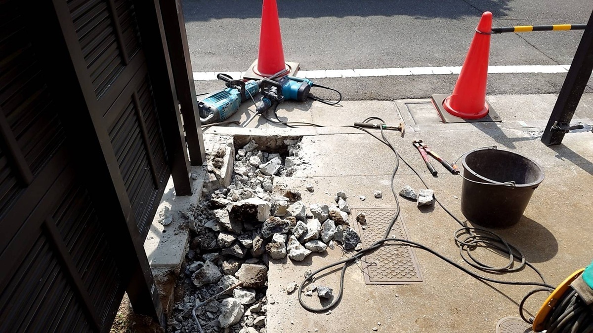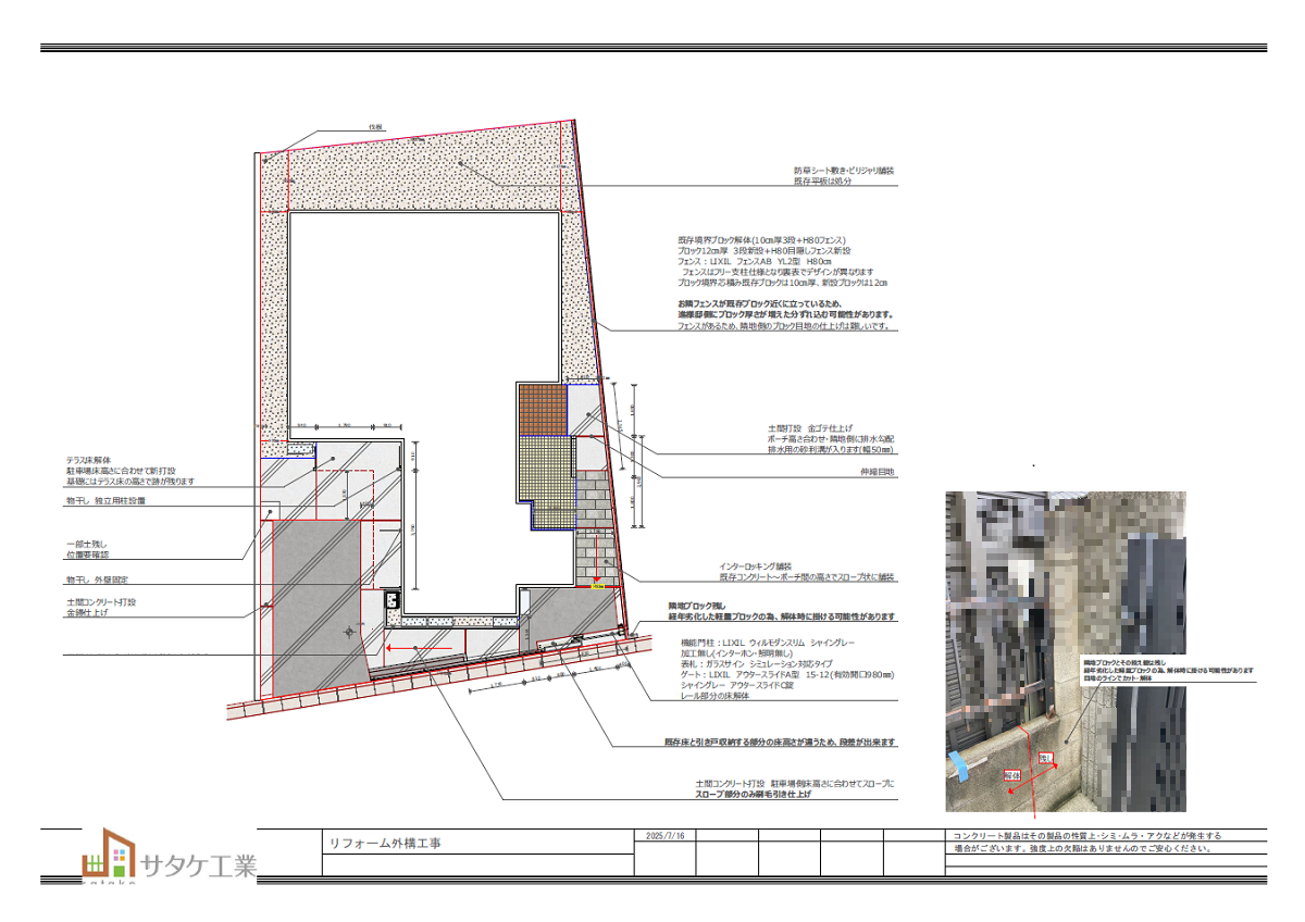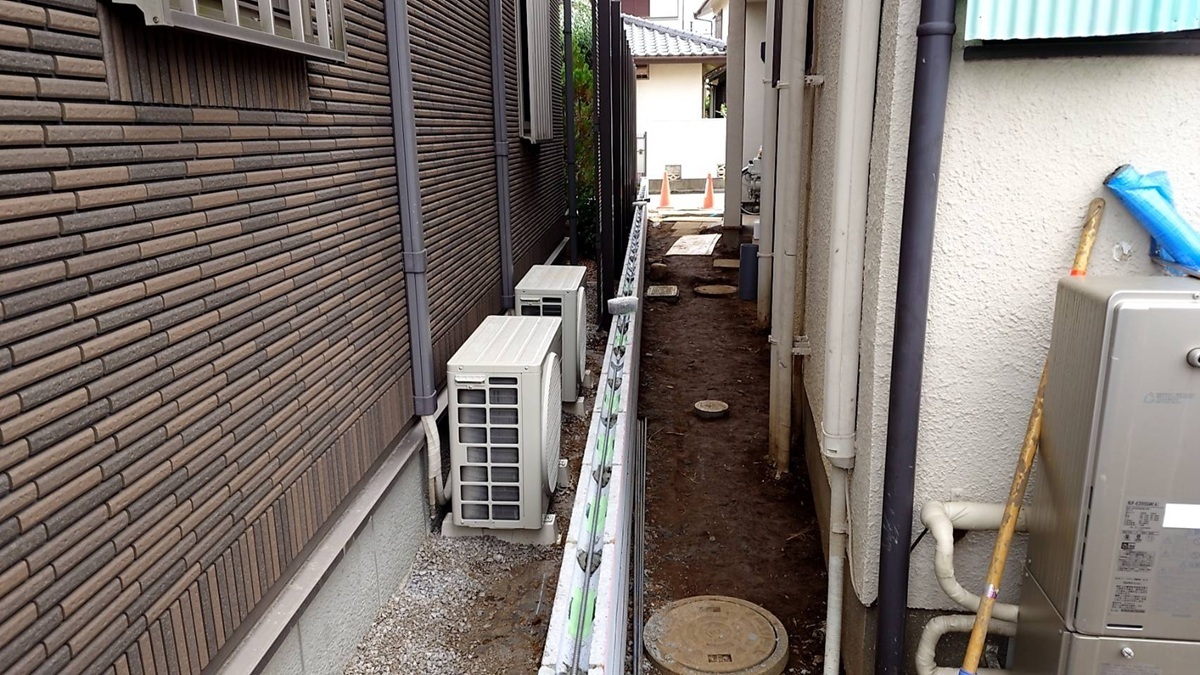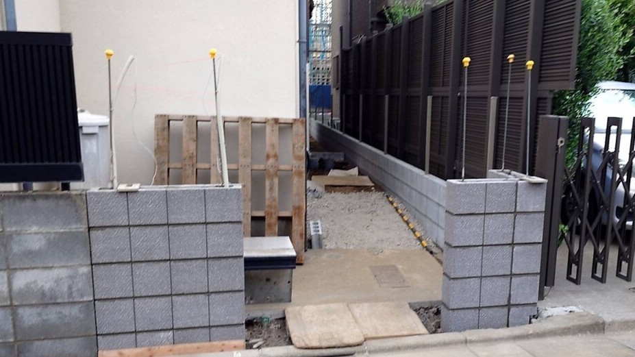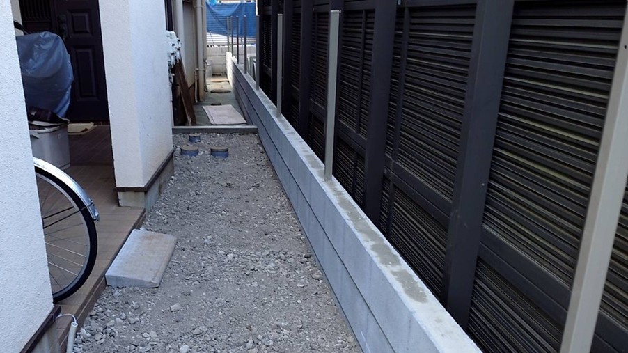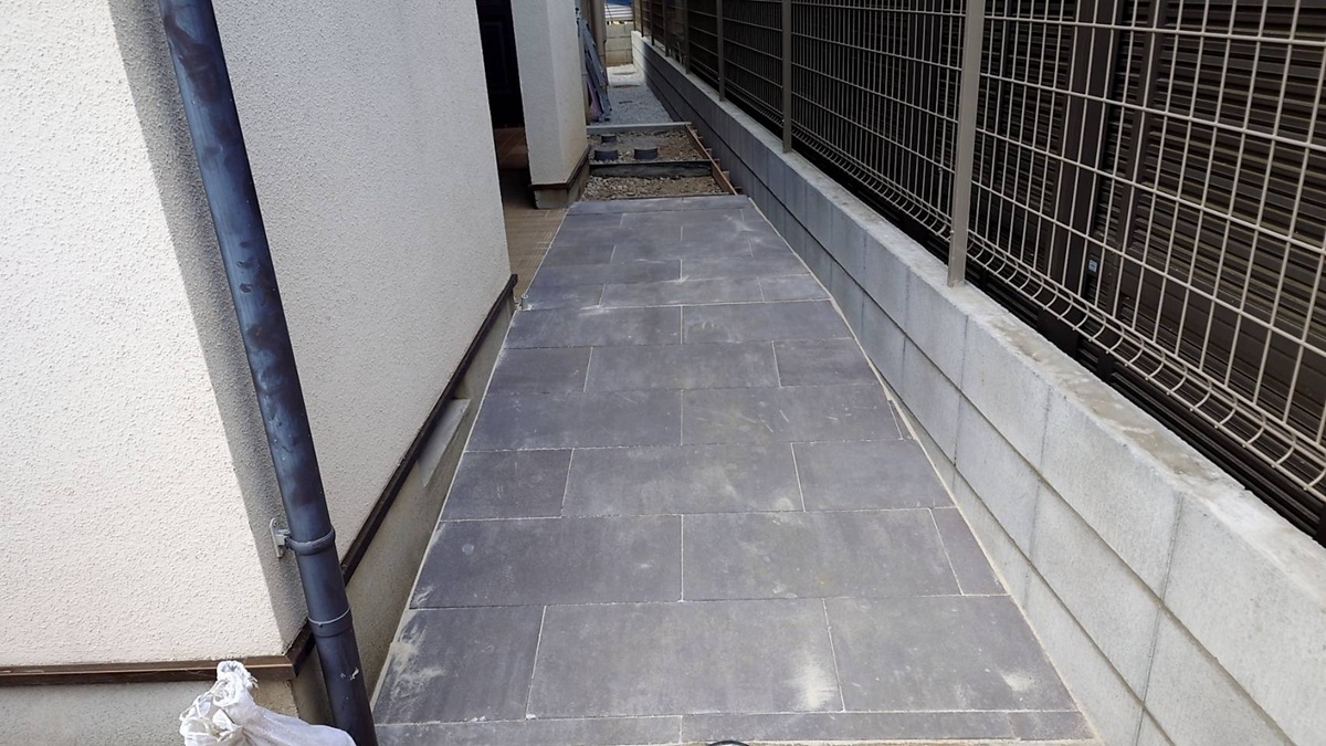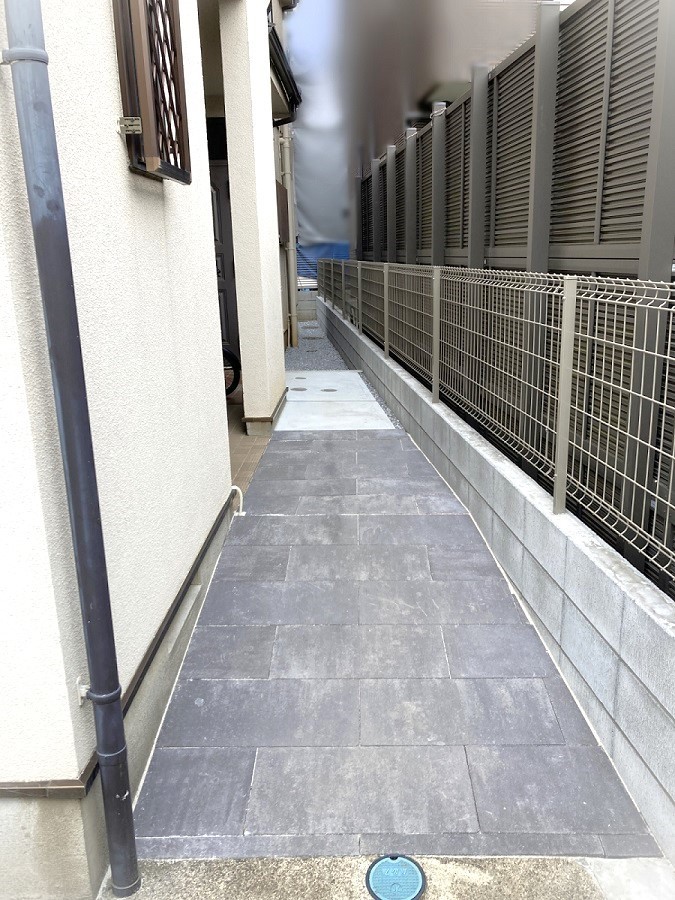 玄関前のアプローチは、インターロッキングと呼ばれるコンクリートブロックを並べてスロープ状に仕上げています。今回は住みながらの工事だったため、コンクリートのような、表面が固まって歩けるようになるまで時間がかかる仕上げではなく、ブロックを敷き込む方法にすることで、普段の生活動線をなるべく止めずに工事を勧められる提案・施工をしました。
