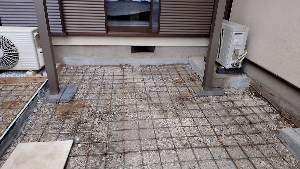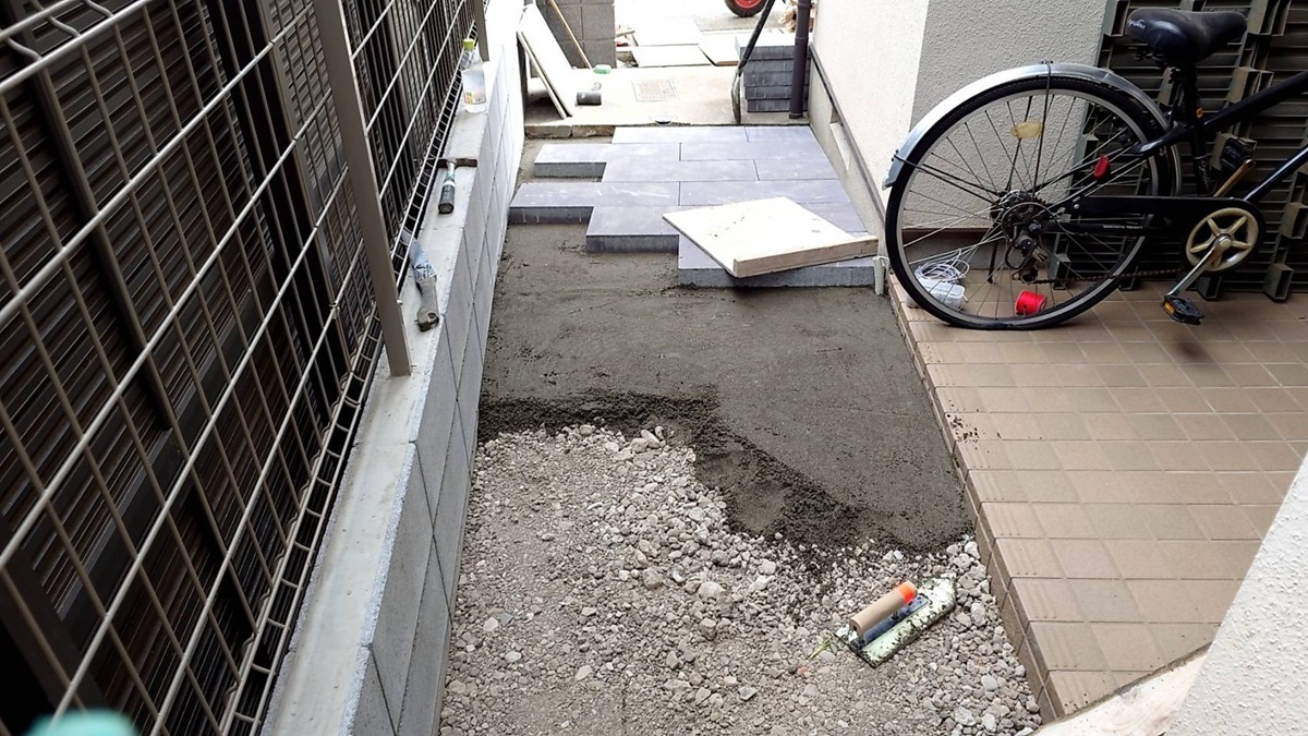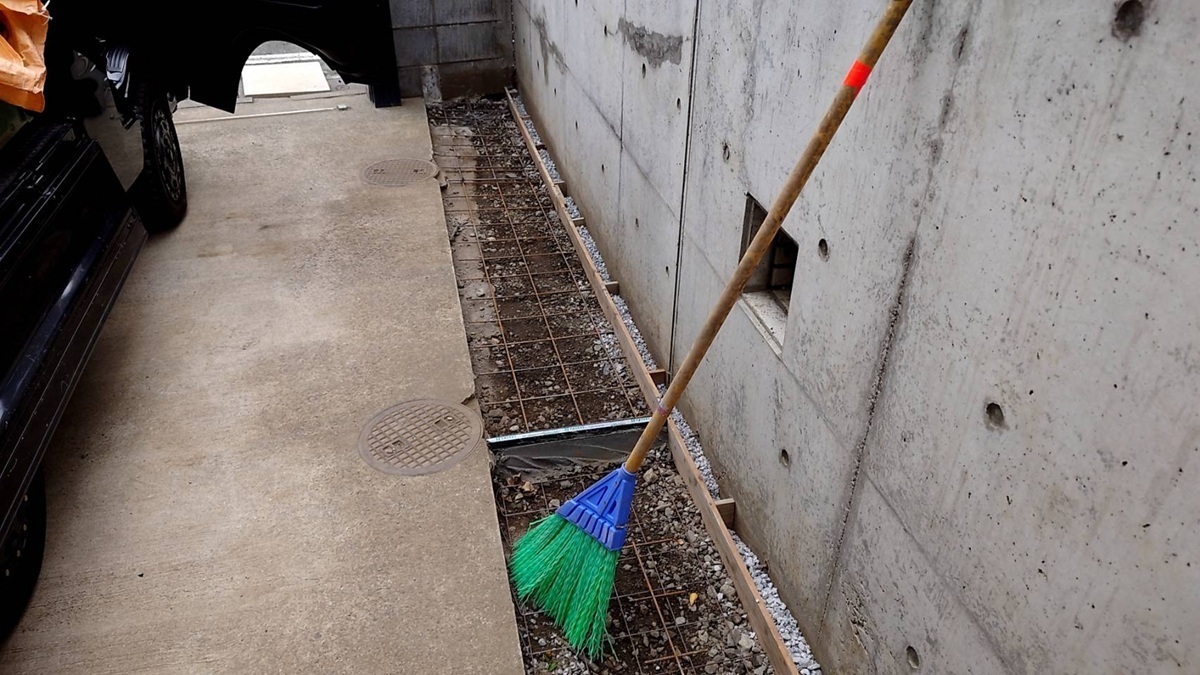 駐車スペースまわりはコンクリート土間でスッキリと。建物裏側は防草シートと砂利を敷いて、雑草抜きの手間を減らしています。コンクリート部分は段差をできるだけなくすため、花壇や小上がりになっているテラスは駐車場の高さに合うように解体、調整をしました。どうしてもスロープになるところは、表面を箒で模様を付ける「刷毛引き仕上げ」とし、雨の日も滑りにくいよう配慮しました。