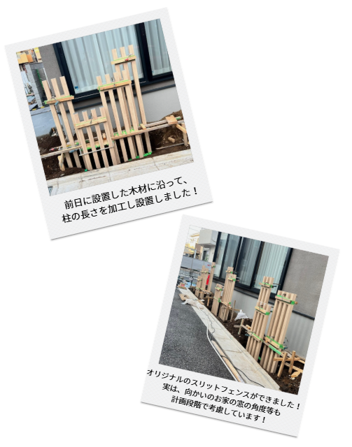 お客様に確認を頂いたうえで、柱を立てる位置が決まったので、風で倒れないようにしっかり仮止めしています。柱は必要な長さに切って、計画通りの場所に並べました。
