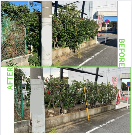 前回は、植栽がかなり伸びていてて手を入れるのが大変でしたが、一度整えてある分、今回はとてもスムーズに進みました。高さを揃えながら、道路や駐車場の隙間に枝がかからないようにしっかりと剪定をしました。見た目もすっきりして、安心して通れるようになりました!