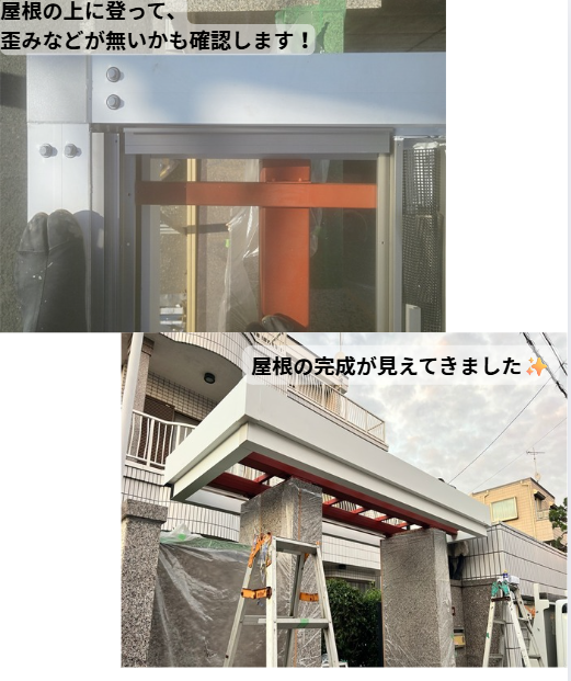 既存の木造屋根を耐久性を重視してアルミ製のメーカー品で作成中です。門柱などでアルミ造作の経験はあるものの、今回はスケールも複雑さも段違いです!何度も打ち合わせをして、担当プランナーとたくさん話し合いました!