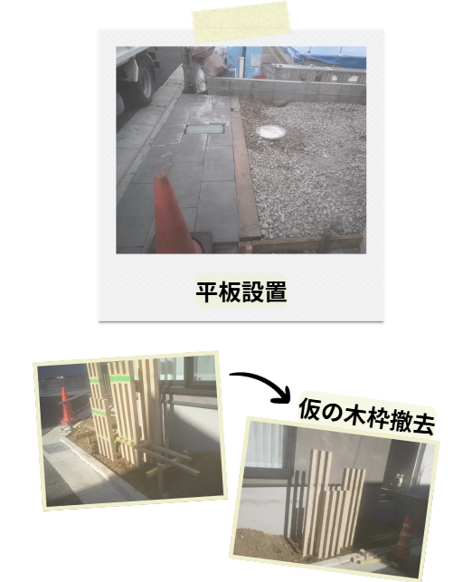 本日は、玄関回りの平板(コンクリートの板)を並べました。歩くときの安定感はもちろん、見た目の美しさにもこだわっています。また、列柱部分の仮止めを行った木の枠の解体も進め、次の工程に向けて準備が整ってきました。インターフォンのカバーも設置し、門袖の飾り金具も加工しました。