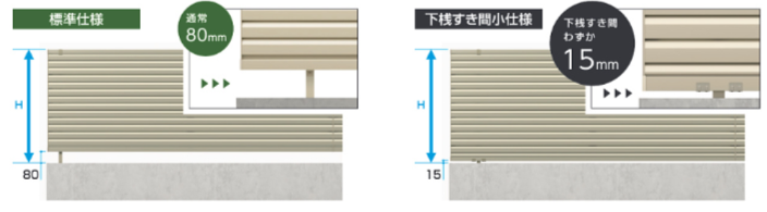 今回使用したのは、新商品の下残すき間が15mmにも対応可能な新商品です。下残すき間小のメリットとしては、外部からの除き軽減、ペットのすり抜け防止、ゴミの投棄防止等が挙げられます!また、今まではオプションですき間カバーを取り付けられましたが、標準使用になった事で価格も抑えることができます!