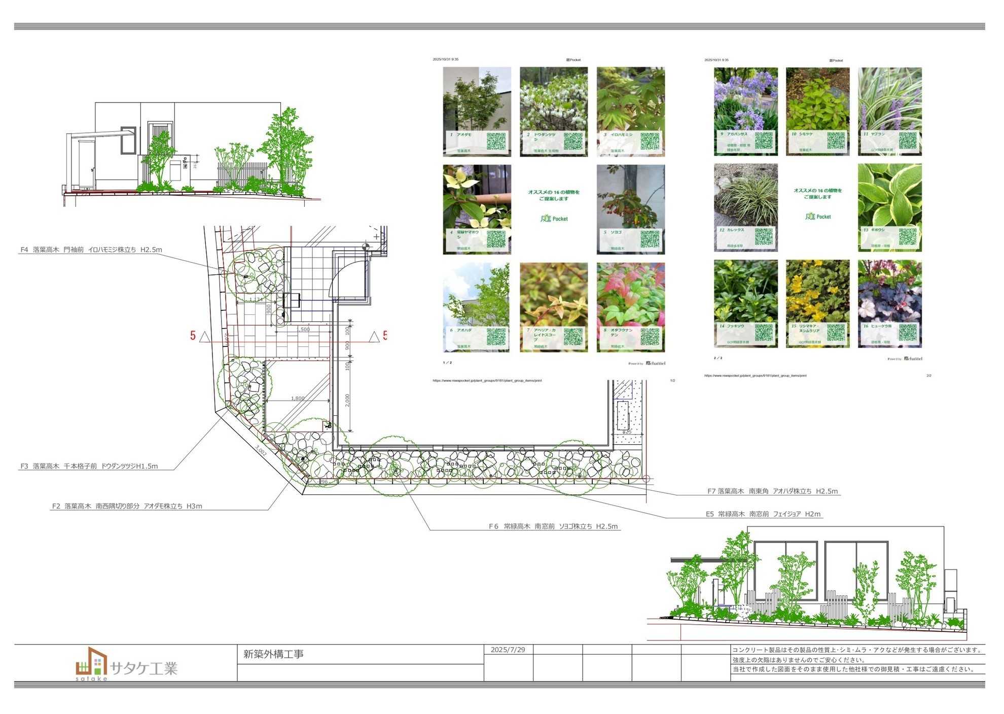 新築物件の植栽計画を確認。図面上の配置と実際の植栽資料を見比べながら、種類や組み合わせを把握。