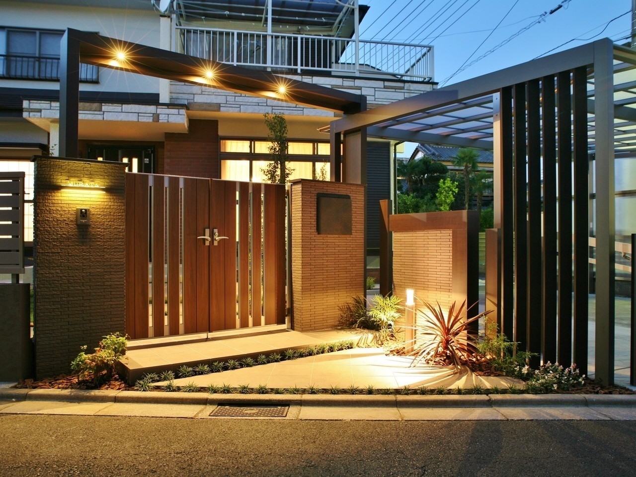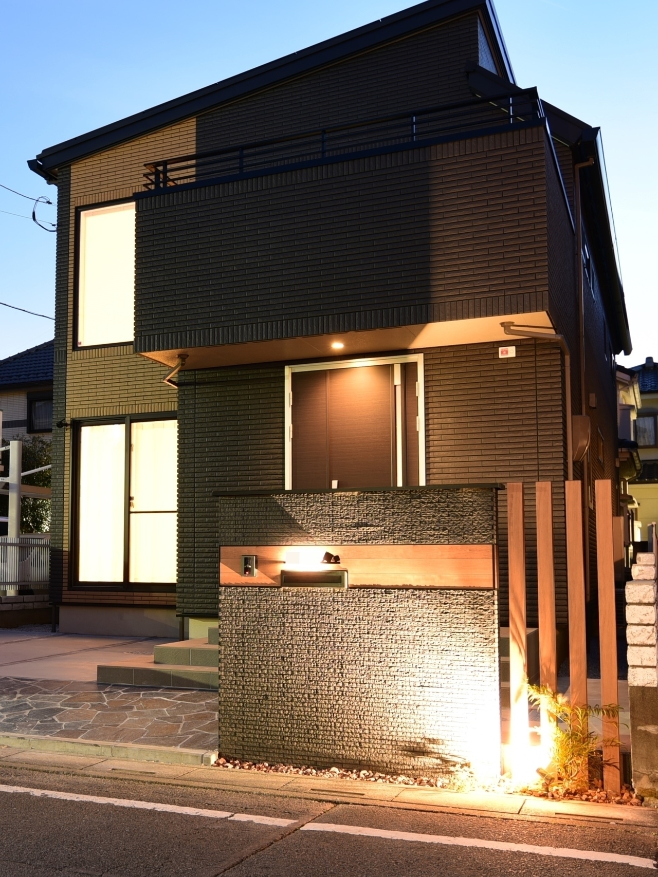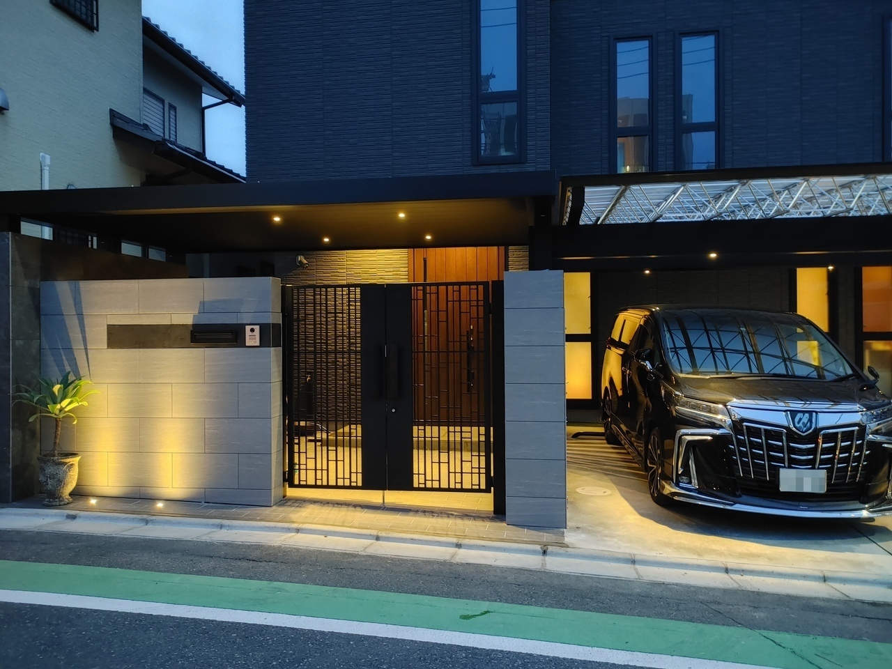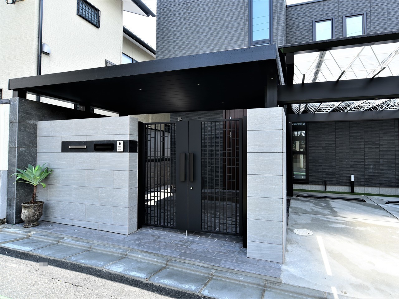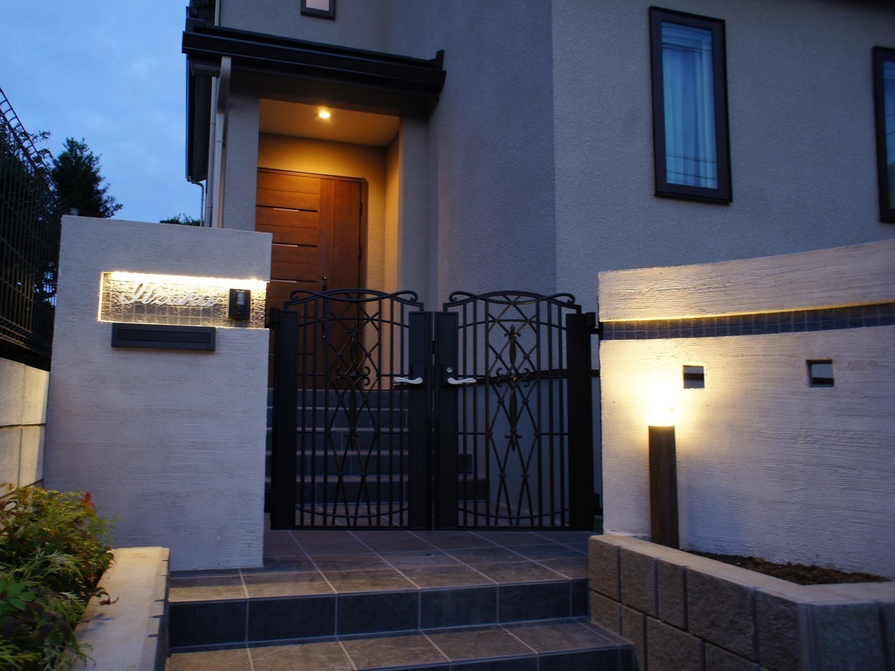 ハイクローズの門周り、大判タイルを使用しポストサイン周りは色を変えたブラックラインのタイルで