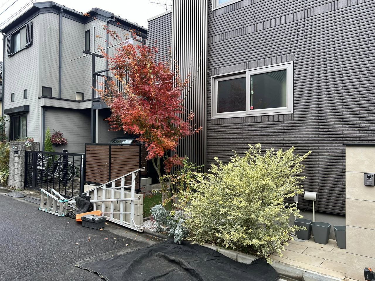 足元のオタフクナンテンやクリスマスローズのお手入れも合わせご希望サイズに剪定。自己管理の方法や肥料のあげ方などのアドバイスもしています。